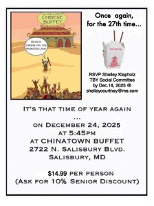 Yup, TBY’s Social Committee is once again meeting on Christmas Eve, Wednesday, December 24, 2025, at 5:30pm. Meet us at the Chinatown Buffet in 2722 N. Salisbury Blvd., Salisbury, MD. Please RSVP shelleycourtney@me.com by Dec. 20, 2025