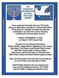 Come celebrate Chanukah with your TBY family. Bring your Menorahs & candles for a Grand Illumination! There will be fun activities for adults and kids and participate in our Dairy Pot Luck by choosing something from the list below to share.